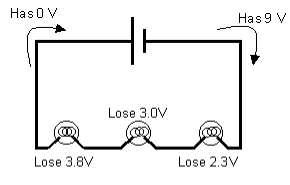 the voltage drops. The battery is 9.0V and the current is 0.75A. Tell me what