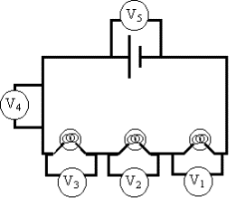 What will we see at V5? There is a change in potential, it’s just not a drop. Since this voltmeter is across the terminals of the battery, it will show a potential increase. In this case it should read 9.0V, since that’s the voltage of the battery.