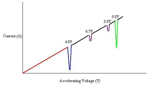 4. At 6.7eV and 8.8eV, mercury will again absorb energy, but there is a smaller probability of it happening. It’s almost as if mercury will eat up those amounts of energy if it has to, but it doesn’t really like the flavour. So the drop in current isn’t as great.