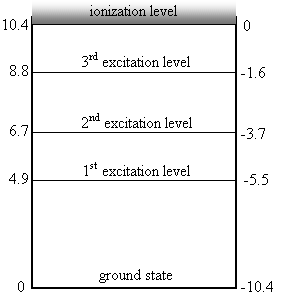 · Along the right side we have how much energy (in eV) the electron in the mercury atom is missing to be able to get out of the atom (this is like the way Bohr looked at hydrogen in the last section using negative values). This is the ionization level.