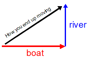 Note: Calling the vectors above "boat" , "river", and "how you end up moving" is not really accurate enough for the kinds of questions we will be looking at in detail. The following examples will show you one way to label the vectors, but you may also use any (reasonable) system of your own that you feel comfortable with.