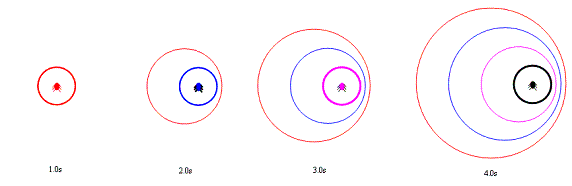 - At two seconds he is at the centre of the next wave he is creating, a blue one. His red wave continues to grow outwards with its centre where he was at 1.0s.